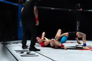 The Grappling Co-Main Event brought another victory for Wales’ Ffion Davies in the ADXC. After sweeping from the closed guard and maintaining Morgan Black under complete pressure in the first round, Ffion finished the job in the following one. When the fighting started again, Ffion pulled Morgan into her guard, went up reaching the side, and quickly mounted, seizing her opponent’s arm and landing the winning armbar with a little over a minute on the clock.
