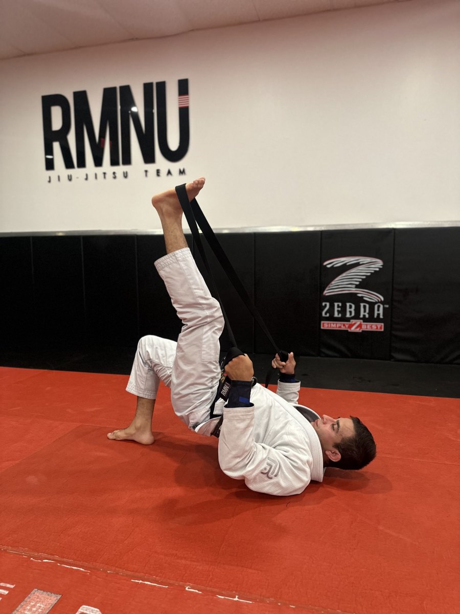 Coloque suas costas no tatame e tire o pé direito da faixa. Em seguida, pise no tatame e eleve o nível do quadril sem perder a tensão da perna esquerda na faixa. Permaneça nesta posição por 30 segundos.