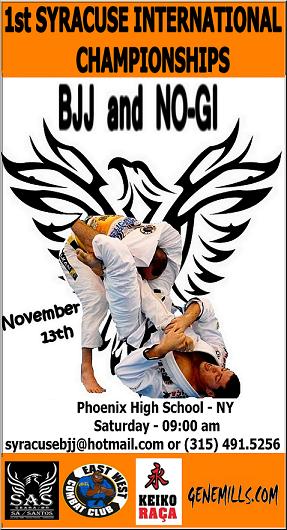 Entretanto, o faixa-preta encara outra empreitada: organiza o 1º Syracuse International Championship. A competição, que rola no dia 13 de novembro, na Phoenyx High School, em Nova York, conta com disputas de kimono e sem.