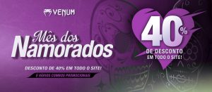 Nossos parceiros da Venum Brasil oferecem um desconto arrasador de 40% em todas as peças do site www.venum.com.br, a fim de que vocês caprichem no presente do Dia dos Namorados.