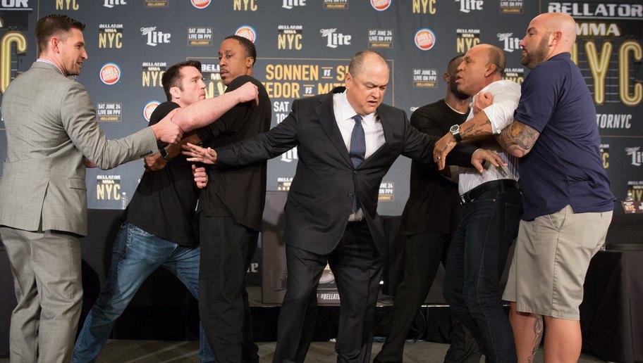 Após uma troca rápida de provocações, o Cachorro Louco partiu para cima e chegou a acertar um tapa no peito de Sonnen, antes de ser rapidamente contido pelos seguranças.